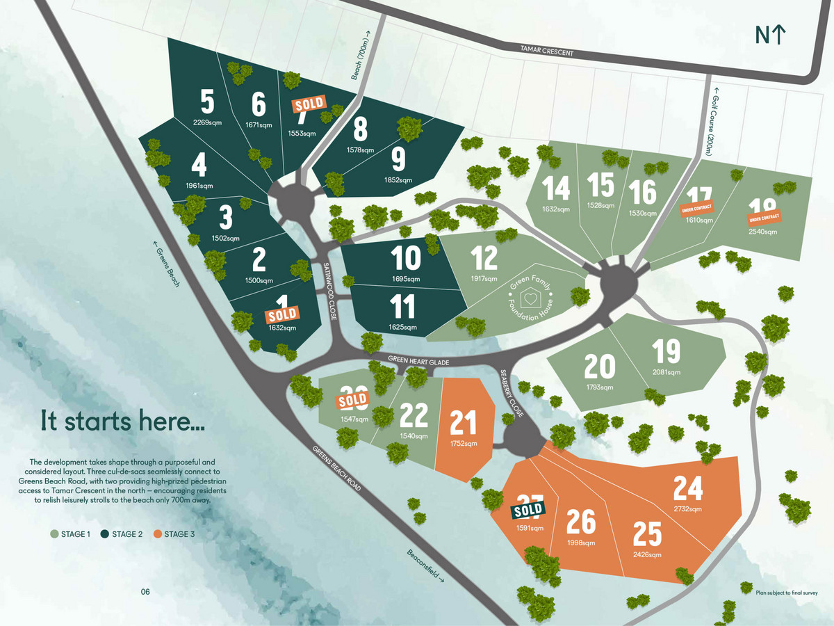 As its name suggests, Green Heart strives to harmonise with the landscape through a light touch and minimal footprint – while preserving the area's unspoiled wonder. In a tightly-held area where options to build are as rare as the unspoiled beachfront, Green Heart emerges as a one-of-a-kind, preserving the area's cherished legacy while ushering in a fresh era of coastal living. The development takes shape through a purposeful and considered layout. Three cul-de-sacs seamlessly connect to Greens Beach Road, with two providing high-prized pedestrian access to Tamar Crescent in the north – encouraging residents to relish leisurely strolls to the beach only 700m* away.